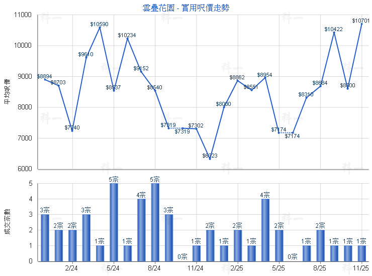 世紀21奇豐物業大圍分行經理張文鏗指出,市場錄得雲疊花園2座低層G室交投,單位面積482方呎,2房間隔,座向西北,外望開揚內園景,成交價267萬元,平均呎價5,539元,屬市價成交,為該屋苑本月暫錄得約5宗交投。