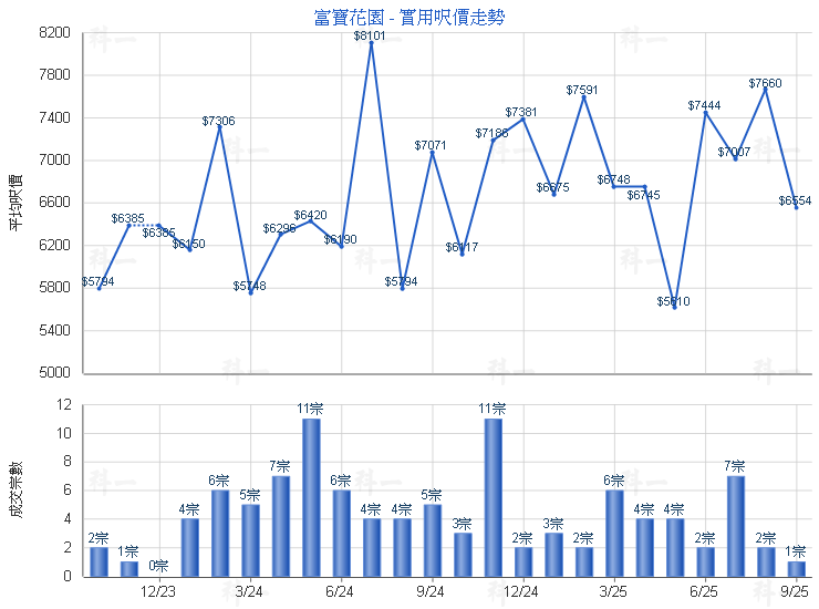 世紀21奇豐物業海柏分行(1)助理區域經理許秋偉表示,上述成交為富寶花園8座高層E室單位,建築面積502方呎,實用面積431方呎,間隔為2房,附設企理裝修,座向東南方,望山景,成交價332萬元(自由市場),建築平均呎價為7,703元,實用面積平均呎價6,614元,較同類型單位高5%成交。